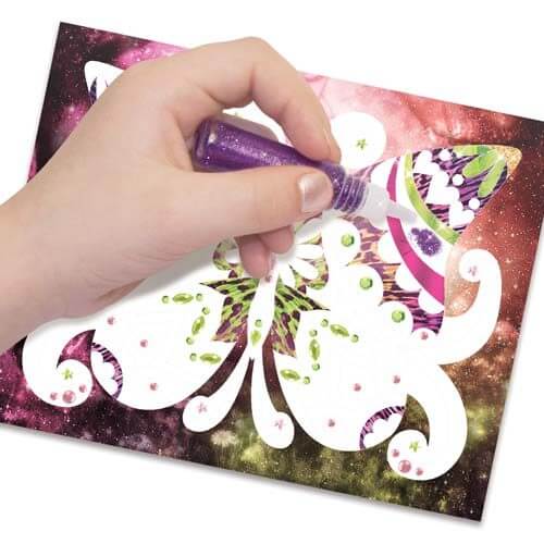 הכינו יצירות אומנות מדהימות ומנצנצות בדרך קלה ופשוטה. קלפו את הכיסוי מהאיזור שתבחרו וקשטו בעזרת ניירות מטאליים, אבנים צבעוניות ונצנצים.